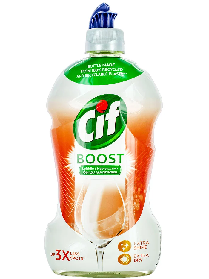 Cif Shine & Dry Boost Aclarado con agentes abrillantadores y secantes para una vajilla bonita. El envase está fabricado con material 100% reciclado y es reciclable.