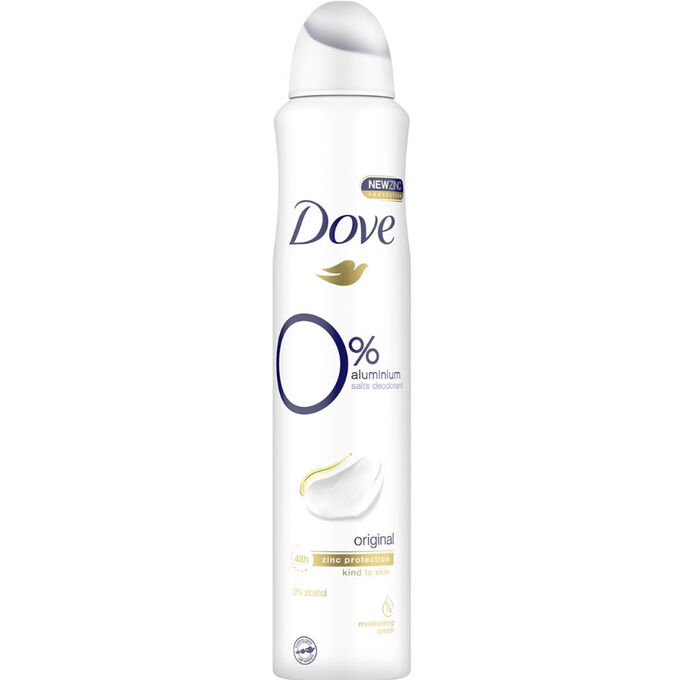 El desodorante antitranspirante Dove Original Aerosol está formulado sin aluminio, con 1/4 de crema hidratante, hipoalergénico, sin alcohol y con una fragancia neutra. El desodorante tiene eficacia anti olor y tiene una duración de 48hs.