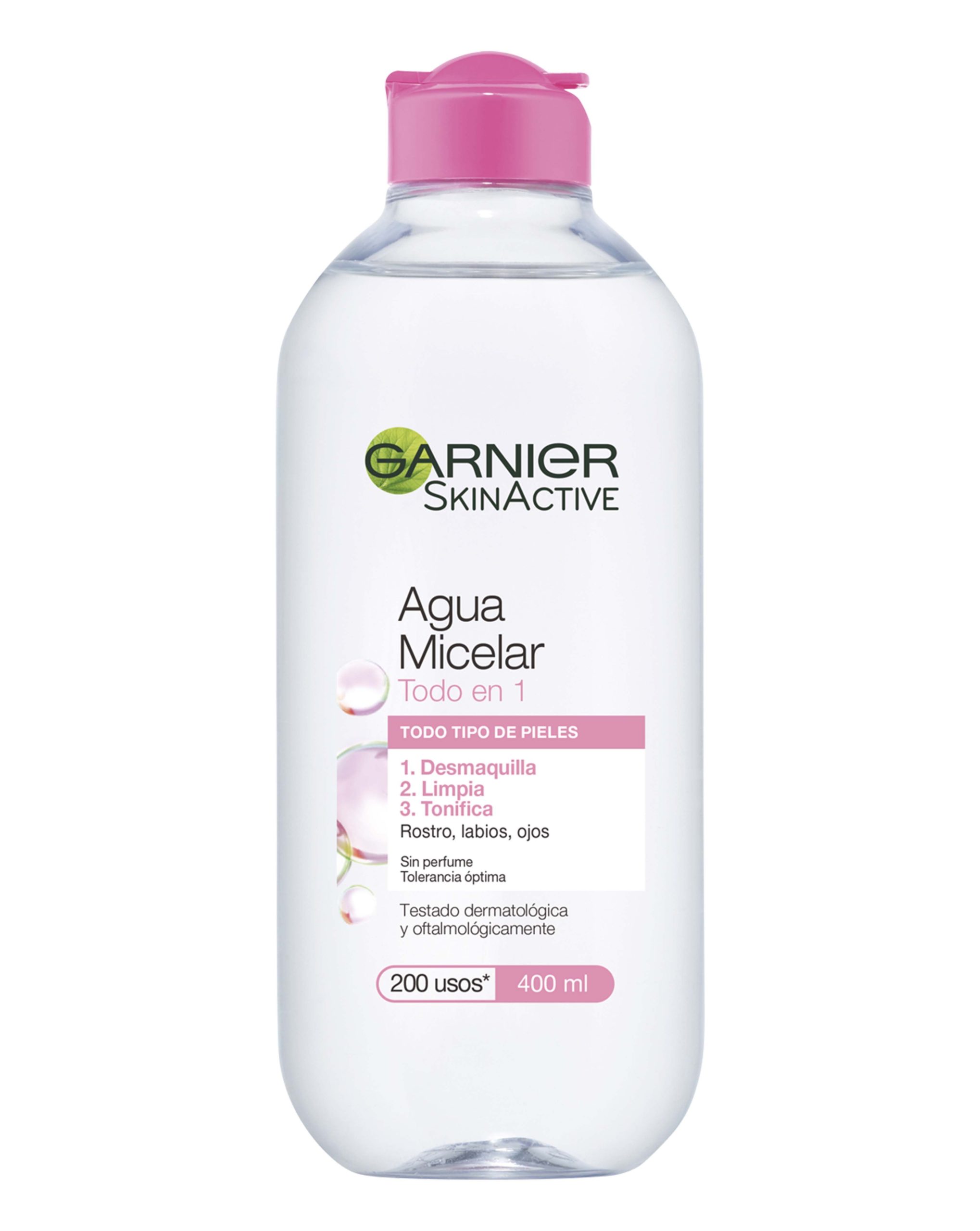 Garnier SkinActive Agua Micelar Todo en uno- 400ml. es la forma más fácil de desmaquillar, limpiar y suavizar todo el rostro (cara, ojos, labios) en un solo gesto y sin aclarado.