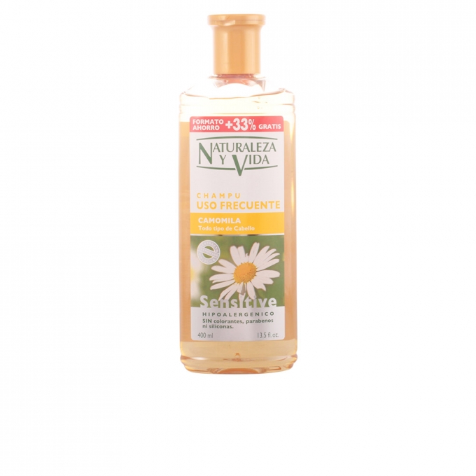 Productos de peluquería Naturaleza y Vida CHAMPU SENSITIVE Camomila. Champú hipoalergénico purificante y reequilibrarte, formulado con extractos de lima y hamamelis. No contiene colorantes, ni siliconas, ni conservantes, ni parabenos ni aceites minerales.